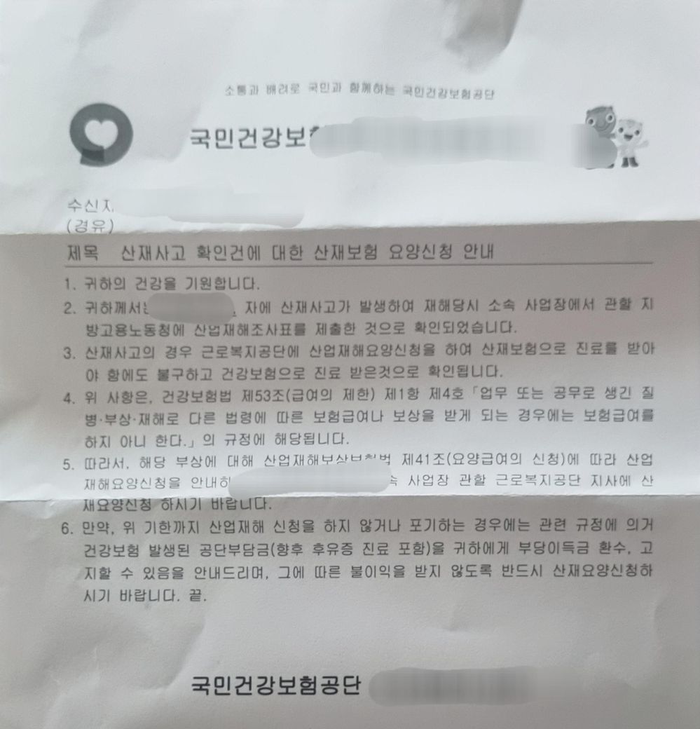그런데 얼마전 건강보험 측으로 부터 이런 등기를 받았습니다. 회사측에서 공상처리를 하자 한건데 보험 금액에 대해 저희가 돈을 물어야 하는 걸까요?