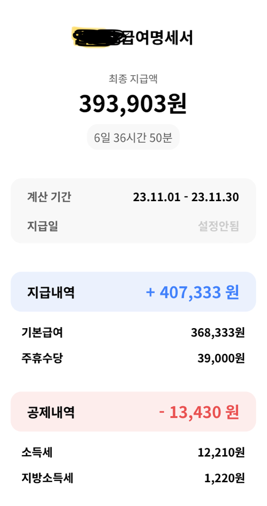 지급총액 407, 333원의 3%인 12,210원의 사업소득세와 0.3%인 1,220원의