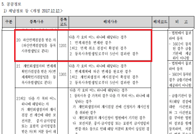 파산면책 1201코드의 삭제 기준에 대한 문의??