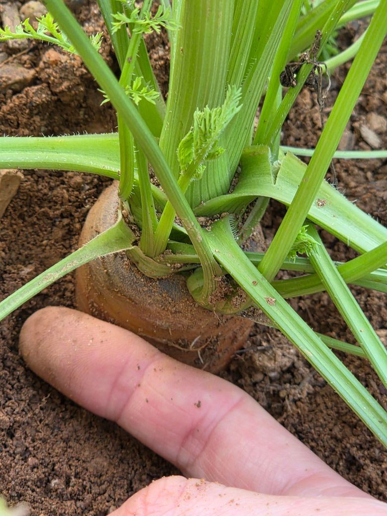 사진 속 당근은 이미 지름이 꽤 굵고 어깨 부분이 흙 위로 많이 올라온 상태라 수확해도 괜찮아 보입니다.