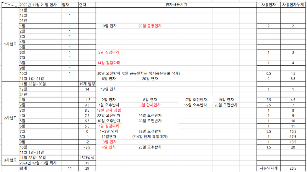 23년1월에 이월연차 및 미래에 발생할 월차 및 연차를 더해 26개의 연차를 부여받았고 23년에 23년 11월 20일까지 6.5개의 연차를 소모했고