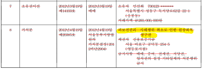 소유주가 8번 신용보증기금에 채무가 있었는데 변제하지 못하고 있던 상태에서 채무자 본인 해당자산을 7번 항목처럼 타인에게 소유권이전을 시키니 채권자인 신용보증기금에서 사해행위라고 법원판결받아 원상회복청구를 하여 등기부상 표기되었고 그후 채무관련 내용이 해소되어 말소된것으로 보여집니다