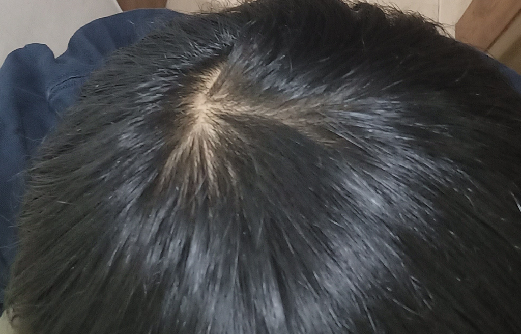 사진의 소견을 통해서 보았을 때에는 탈모증을 의심할만한 부분은 딱히 없어 보입니다. 스트레스 받는다면 피부과에서 정확하게 상태 평가를 받아보시길 권고드립니다.