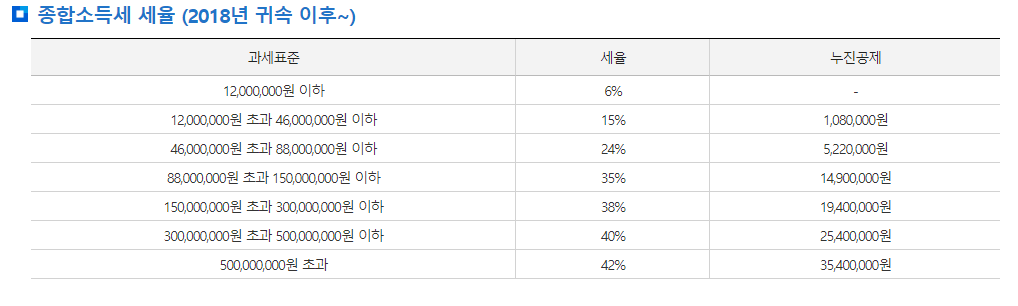 6% ~ 42%의 세율이 적용됩니다. 원천징수는 근로소득간이세액표에 의해