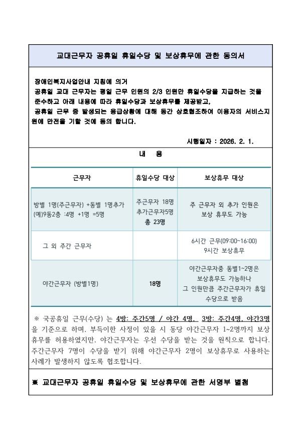 ‘장애인 복지사업 안내 지침에 의거 공휴일 교대근무자는 평일 근무 인원의 2/3 인원만 휴일수당을 지급하는 것을 준수하고 아래 내용에 따라 휴일수당과 보상휴무를 제공받는다‘(아래 내용 사진 첨부)