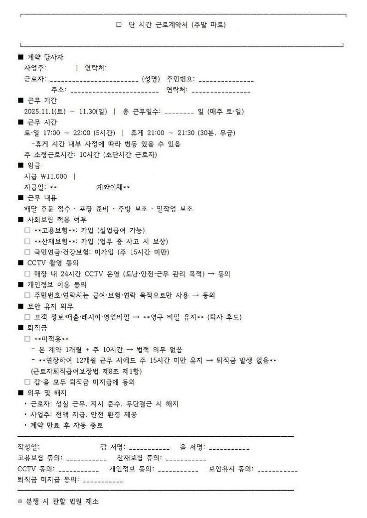 주말알바 초단시간 근로계약서 쓸려고하는데
