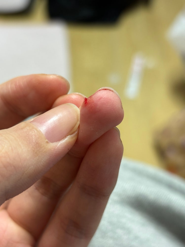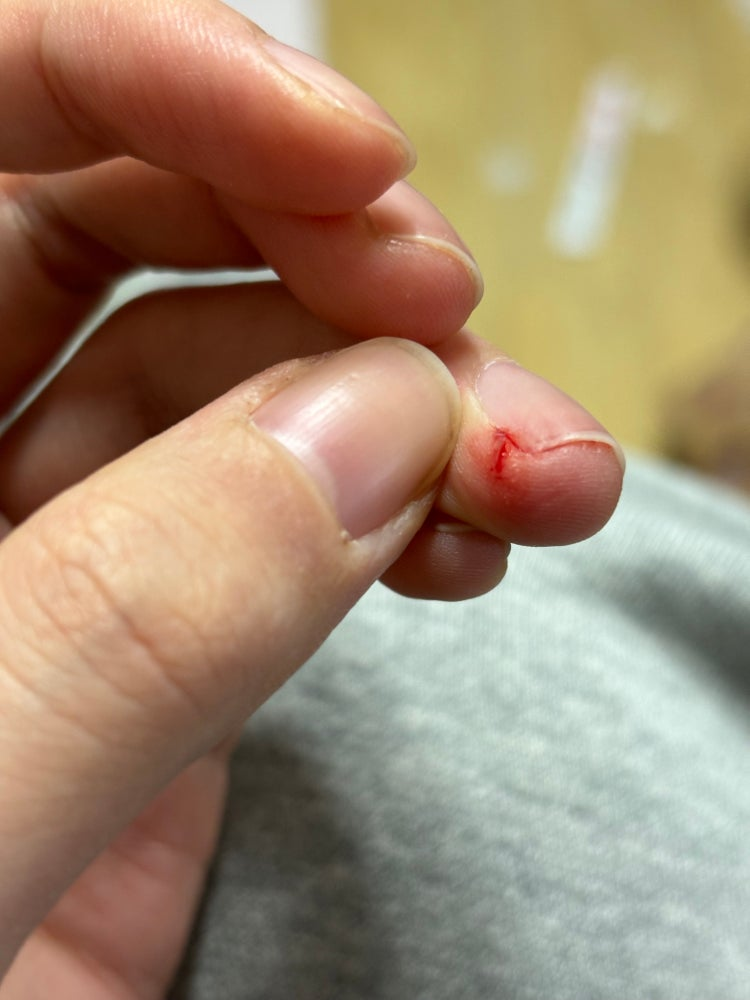 껍데기 살짝 자르지마시고, 그냥 그대로 방수가 되는 밴드를 이용하여 손가락을 돌돌 말아 압박하는것이 도움이될 수 있습니다.