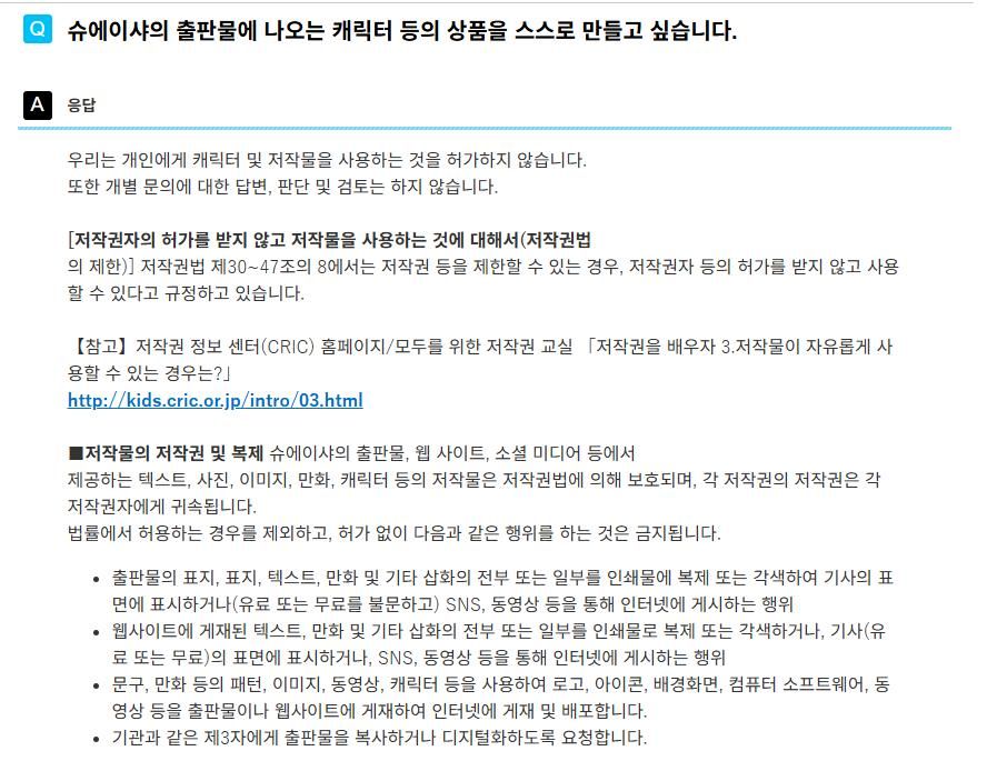해당 슈에이샤의 저작권 관련 개인 항목의 FAQ를 발췌한 사진입니다.