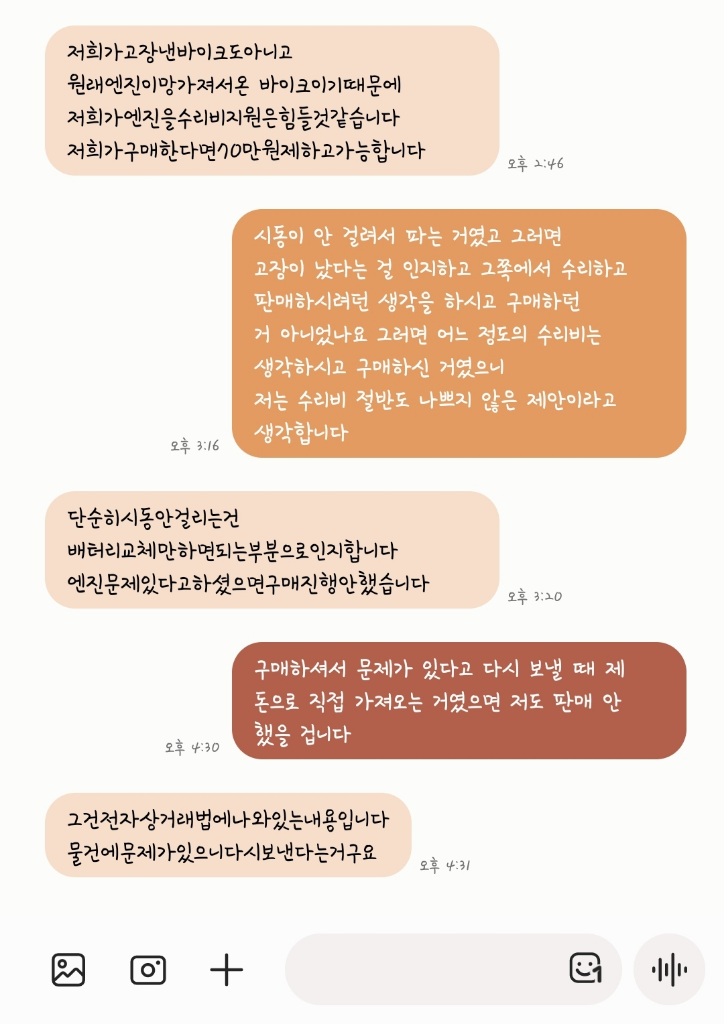 하지만 바이크가 도착 후에 엔진에 문제가 있어서 다시 가져가라고 합니다 운송비 또한 저한테 지불을 하라고 합니다