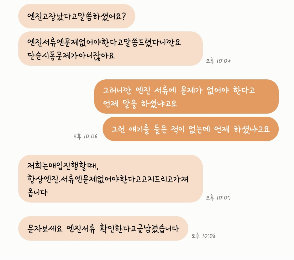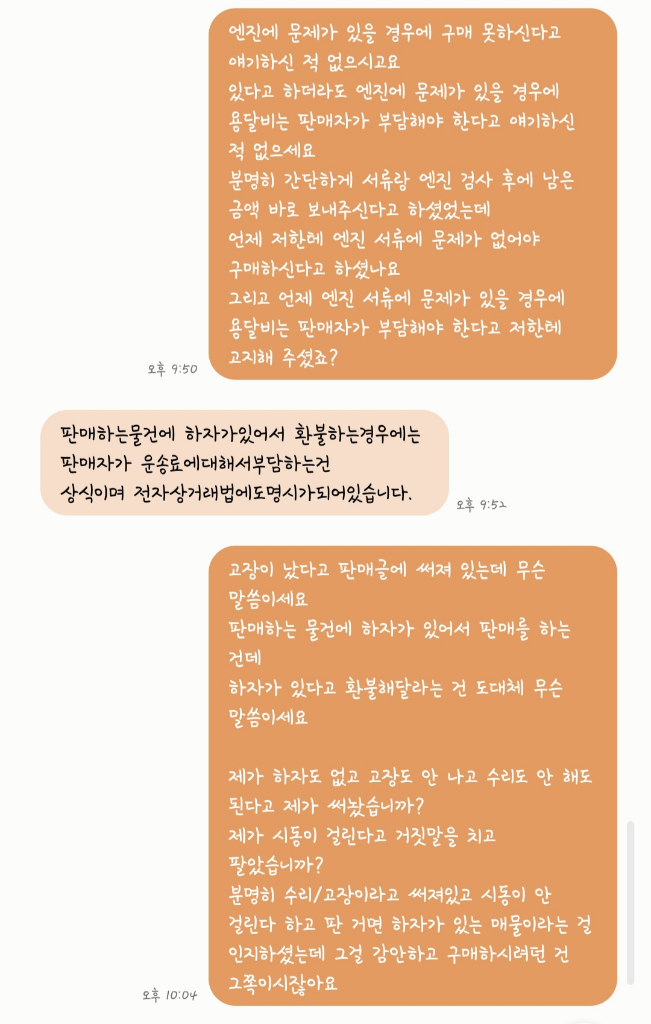 엔진에 문제가 있을 시 매입을 못하겠다고 얘기한 적도 없었고 엔진에 문제가 있을 경우에는 판매자가 운송료를 내야 한다고 말한 적도 없었습니다