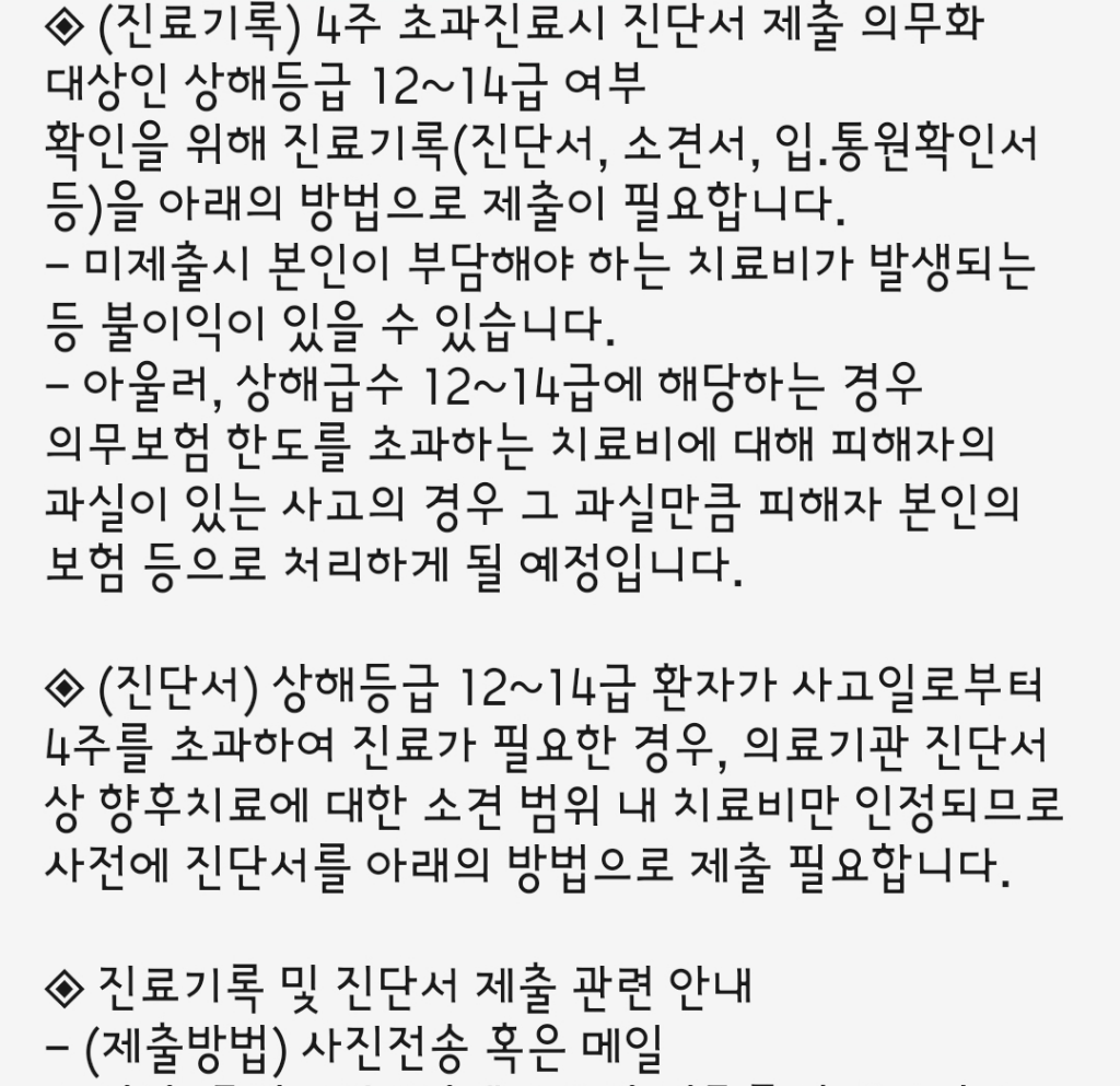 상대방은 진단서를 제출 받지 않으면 최저 부상 등급인 14 등급을 적용하게 되니 뇌진탕 진단이 나온 진단서를 제출해야