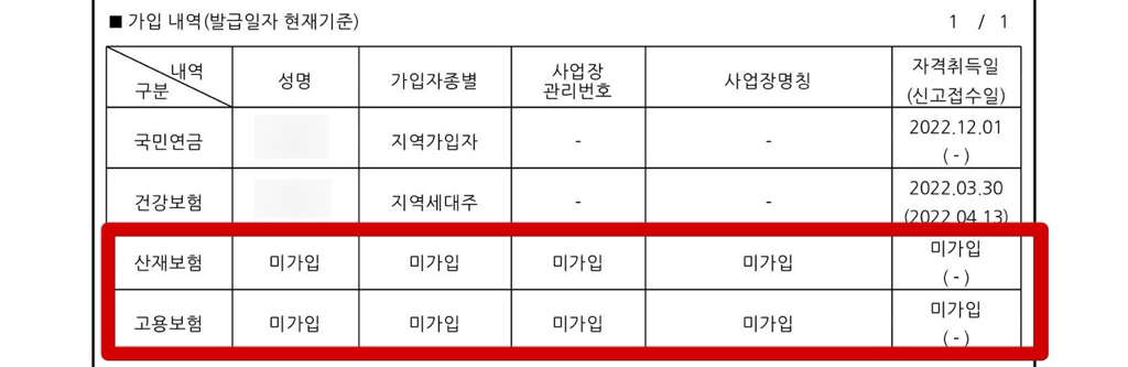 고용보험과 산재보험은 미가입 되어 있다고 나오는데