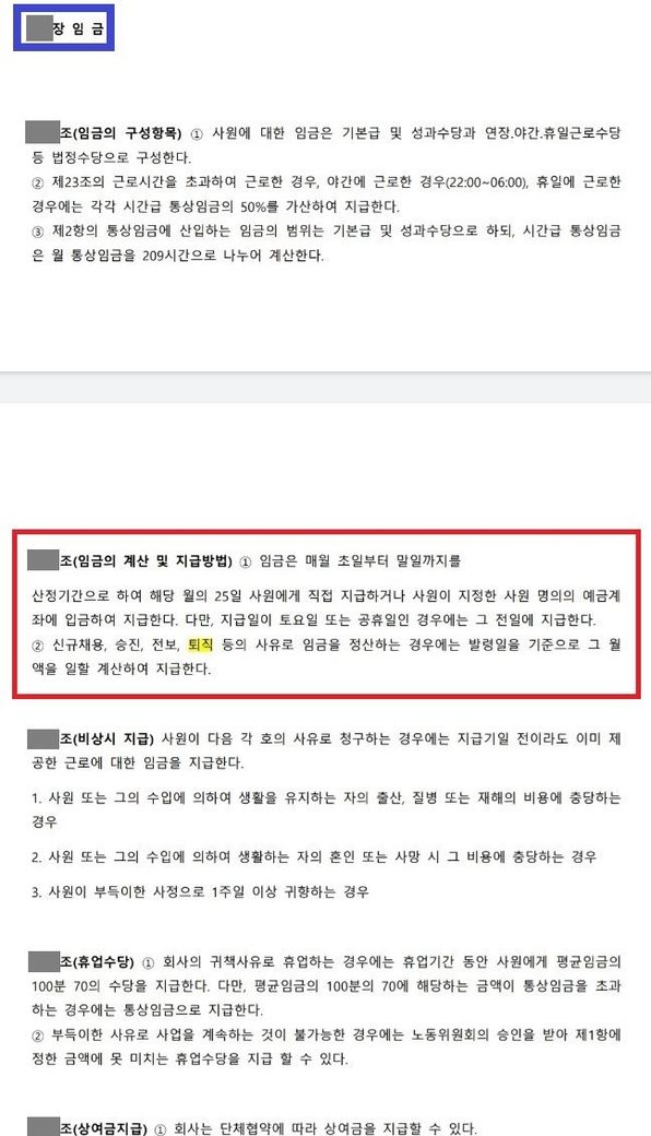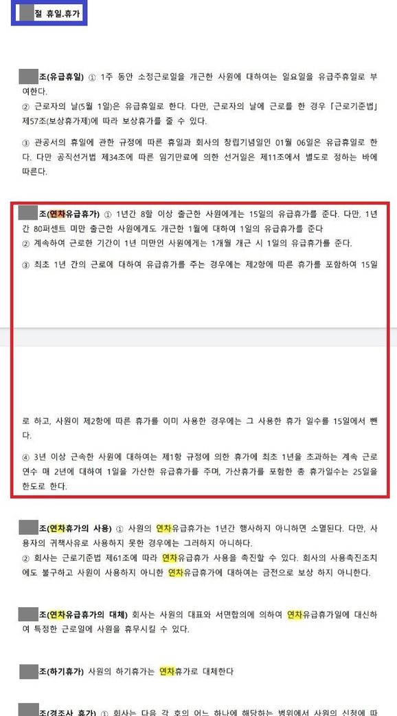 안녕하세요, 기존에 질문 올렸다가 취업규칙 확인이 필요하다는 말씀을 듣고 회사에서 받아서 다시 질문 올립니다.