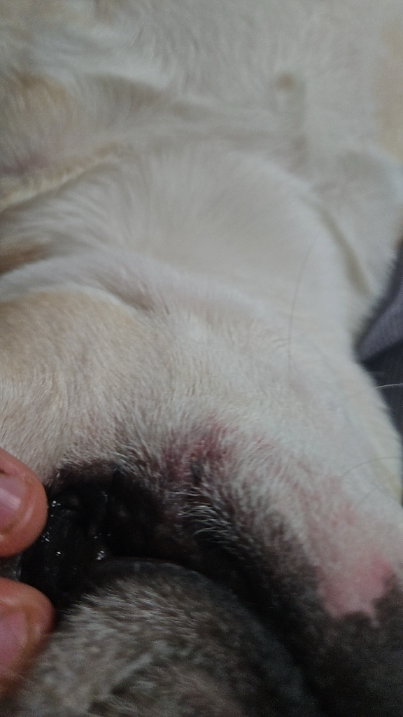 병원 가보시기 바랍니다. 손상된 이차 병변으로 사진만으로 원인 평가를 할 수 없고, 연고 따위를 발라봐야 핥아먹고 소화기계 이상만 발생합니다.