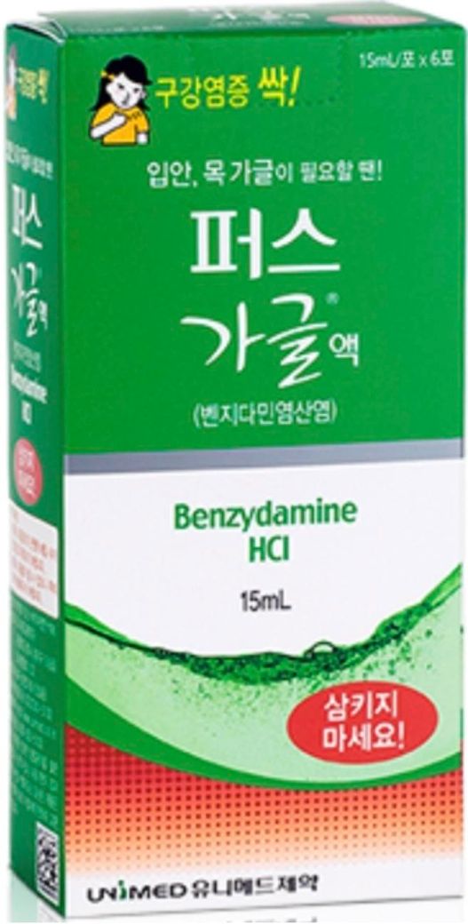 퍼스 가글액의 주성분인 벤지다민염산염(Benzydamine HCl)은 소염진통 작용을 하는 국소 치료제입니다. 주로 구내염, 인후통, 잇몸 염증 등에 사용되며, 구강과 인후에 뿌리거나 가글 후 뱉어내는 방식으로 사용합니다. 이 약물은 삼키는 용도로 개발된 것이 아니기 때문에, 가글 후에는 반드시 뱉어내야 하죠