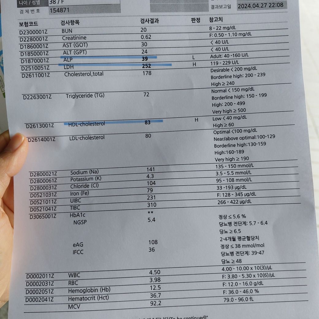 LDH는 수치범위보다 높게 나와서 인터넷검색하니 성인여성280까지.정상이라고도 되어있어서요