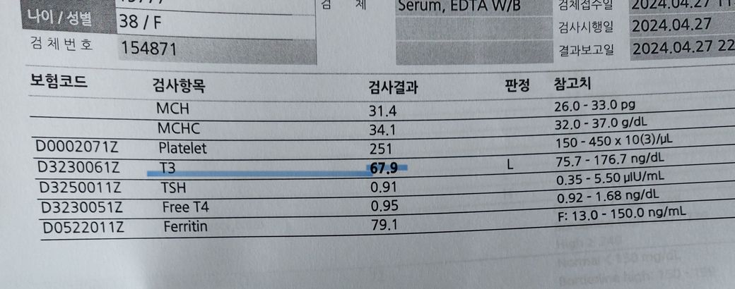 작년 종검때 HDL수치보다 높게 나왔고 T3도 낮게 나왔었는데 T4가 더 중요하다고 괜찮다고 하셨던 것 같아요