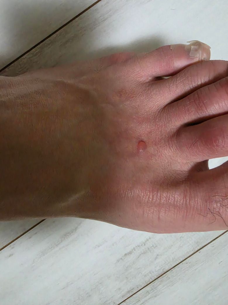 사진상 병변은 작은 수포(물집) 형태로 보이며, 주변에 약한 홍반이 동반되어 있습니다. 위치가 발등이고 단일 병변이라는 점에서 가장 흔한 원인은 다음 범주입니다.