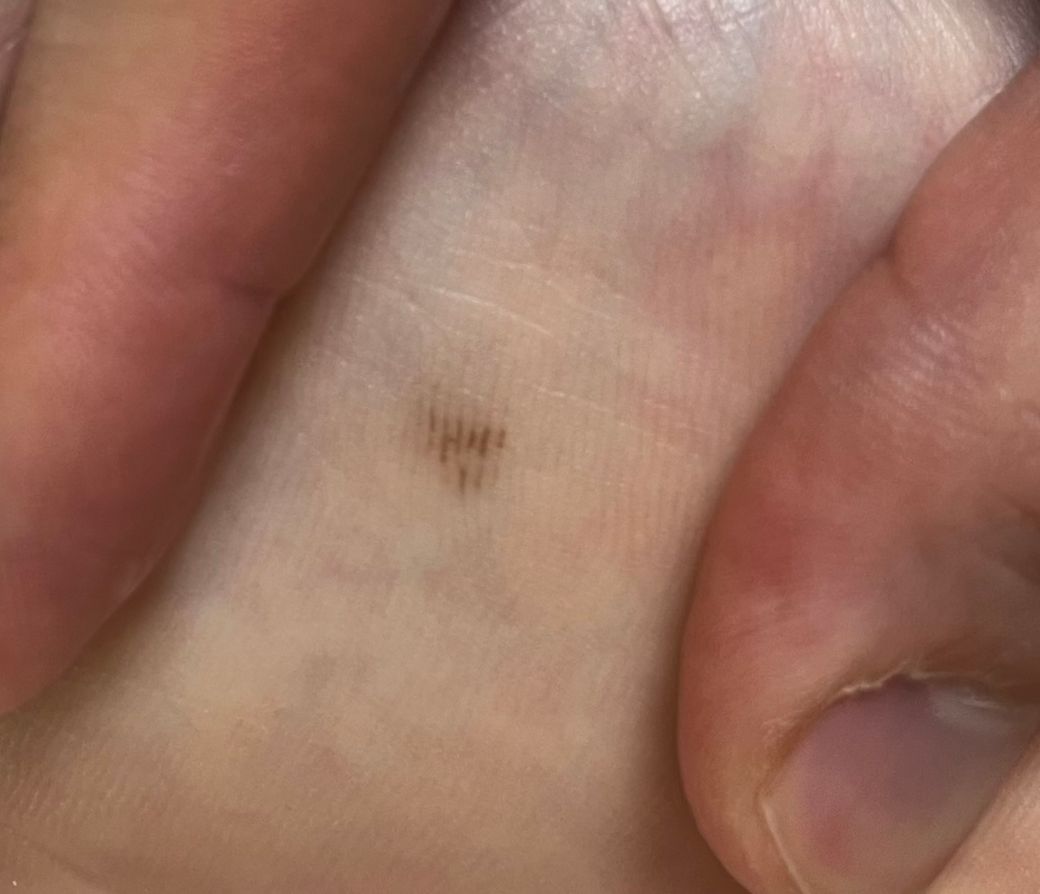 발바닥 지문능선을 따라 선형으로 색소침착이 있고