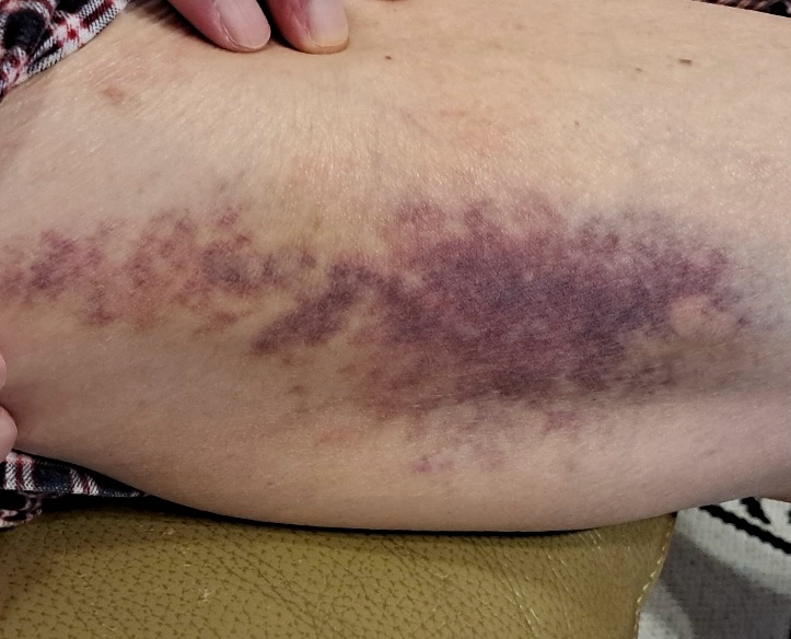 항응고제를 복용하고 계신 상황이므로 아주 작은 충격으로도 큰 멍이 발생할 수 있습니다. 심장 진료를 받는 곳을 방문하셔서 이에 대한 상담을 받아보시기 바랍니다.