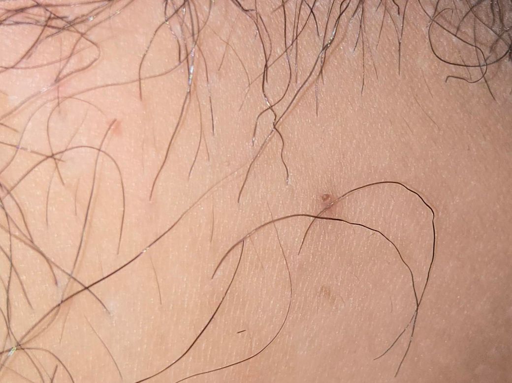 사진상 작은 구진성 병변이 관찰되며 병력상 피부염이나 모낭염 등이 반복되었다가 피부 착색을