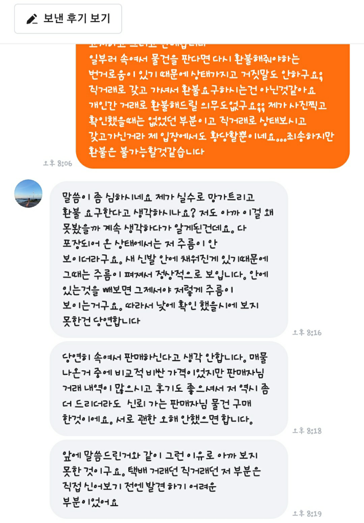 판매한 입장에서는 신어보다가 저렇게 된걸지 아니면 집에 같은 제품이있는데 이미 저렇게 된 신발을 박스는 그대로 냅두고 신발만 바꿔서 환불요청을하시는지 알 수가 없습니다 택배거래라면 제가 보내기전 사진을 다 찍어놨을텐데 직거래라서 게시물 올릴때 찍어둔 사진 말고는 없어서 너무 분하네요 ..이런경우에도 환불을 해줘야하나요??? 당근 측에서는 메크로 답변만 날라와서 답답해서 글 남겨요