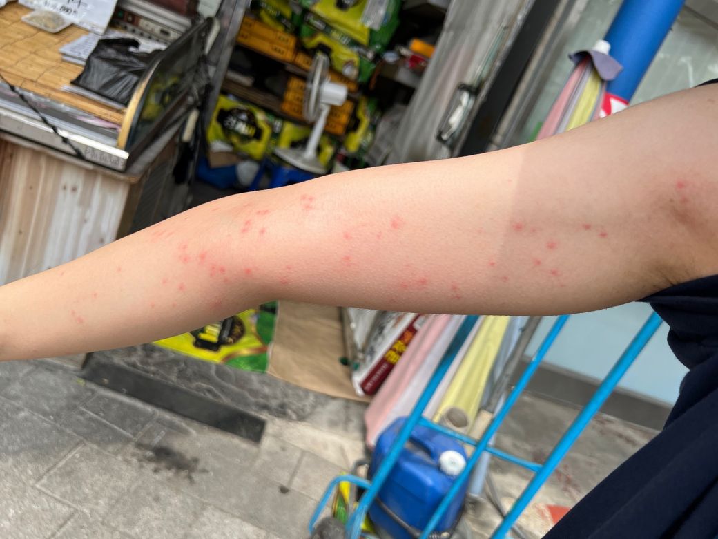 전날 야외 물풀장 청소하고 팔이랑 허벅지가 물린것 처럼 너무 간지러워서 긁었고 간지러운게 진정이 안되서 물파스발랐습니다 아침에 일어나니 저렇게 빨간반점들이 다 올라왔습니다 땀띠인가요