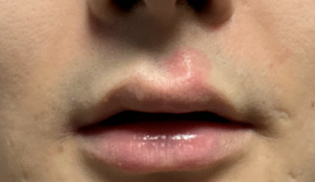 가능성은 헤르페스 바이러스에 의하여 생긴 단순포진으로 보입니다. 수포로 변한다면 단순포진이맞으니 근처 의원에서 항바이러스제등을 처방받아복용하세요.
