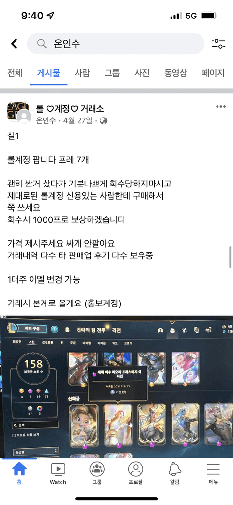 롤 계정을 판매하엿습니다