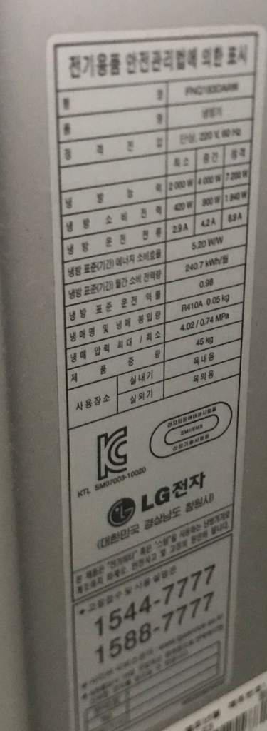 저희집 에어컨 소비전력이 적혀있는 스티커입니다. 하루에 8시간 가동하면 한달에 전기서가 얼마나 나오는지 궁금합니다. 답변 부탁드립니다.