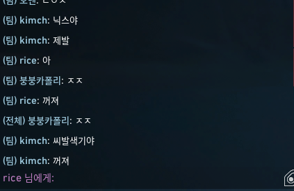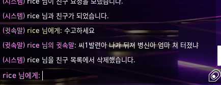처음 시작은 팀 모두가 볼 수 있는 팀 채팅이었습니다. 저는 고소 한다고 경고를 했죠. 그런데 욕설을 멈추지 않았습니다. 심지어는 게임이 끝난 후 친구 추가를 통해 귓속말(1대1 채팅)으로 욕설과 패드립을 했습니다.