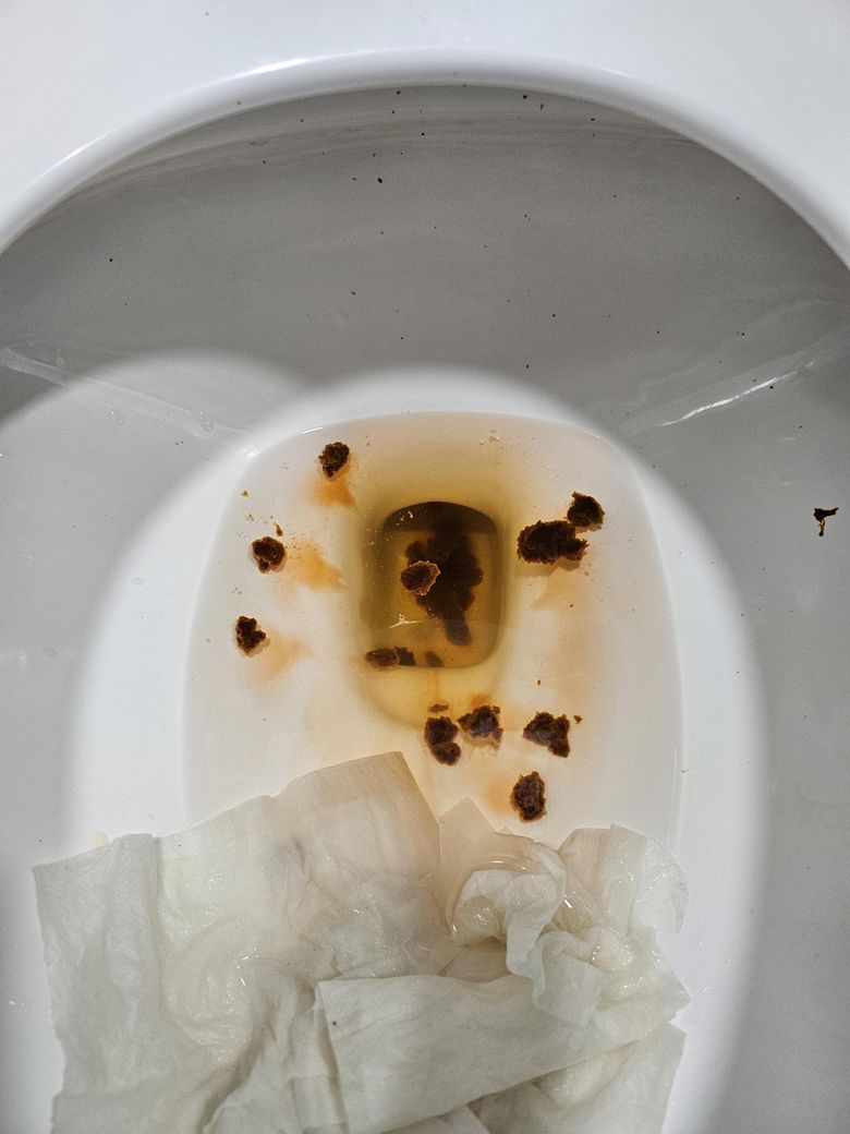 사진 속 대변의 갈색과 붉은색 물은 혈변의 가능성을 시사할 수 있지만, 정확한 진단은 어렵습니다.