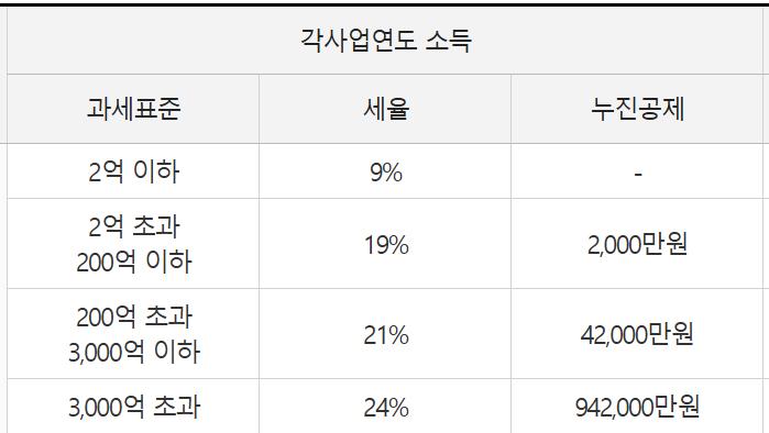 법인세는 과세표준별로 세율을 달리 적용하는 누진세율 구조입니다.