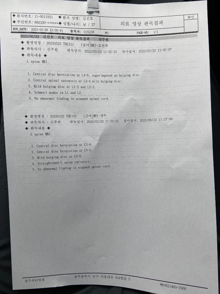 판독지를 보니 요추부위와 경추부위 모두 건강한 편은 아닌 것 같습니다.