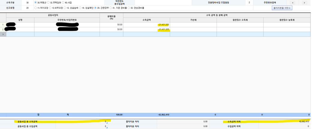 공동사업장의 총 소득금액을 기재 안한 것으로 보여지니 확인해보시길 바랍니다.