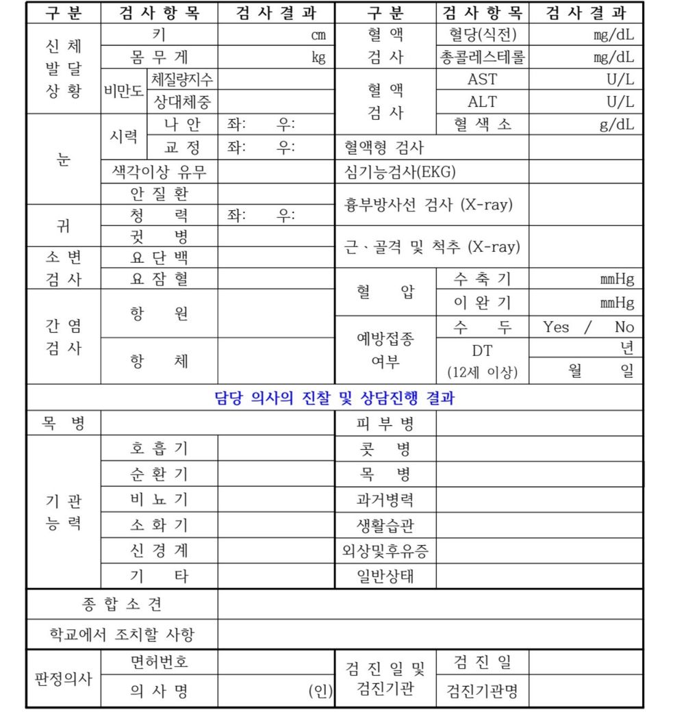 서류중에 학생건강검진기록이 있는데 이전에 오래전에 받았던 학교 신체검사 정도로 생각했는데. 혈액검사도 있는 것으로 봐서 일반건강검진 수준이네요.