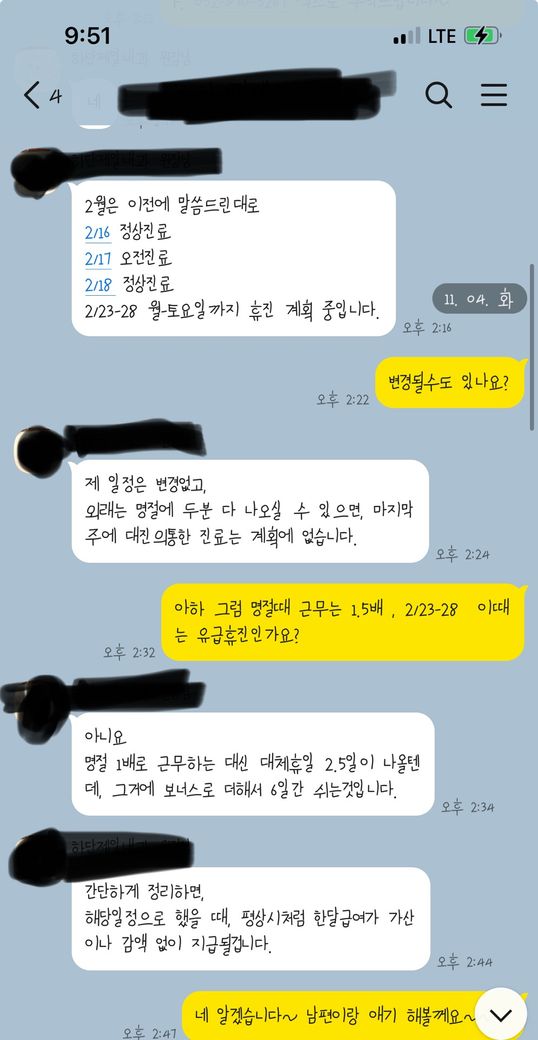 오전에 원장님이 명절 근무 때문에 톡을 주셨는데 ..