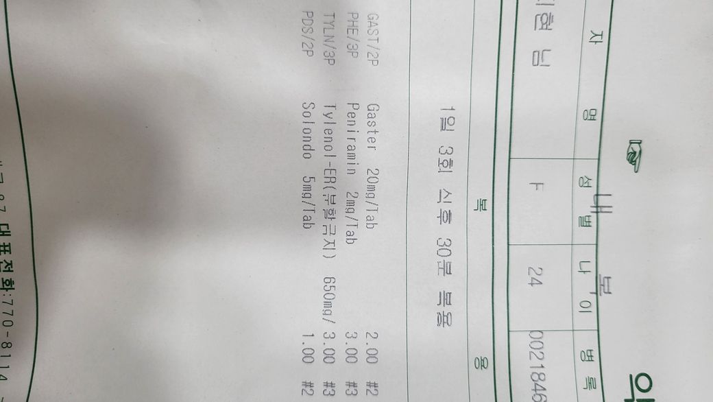 가스터정 / 페니라민 / 타이레놀 / 소론도를 처방 받으셨기에