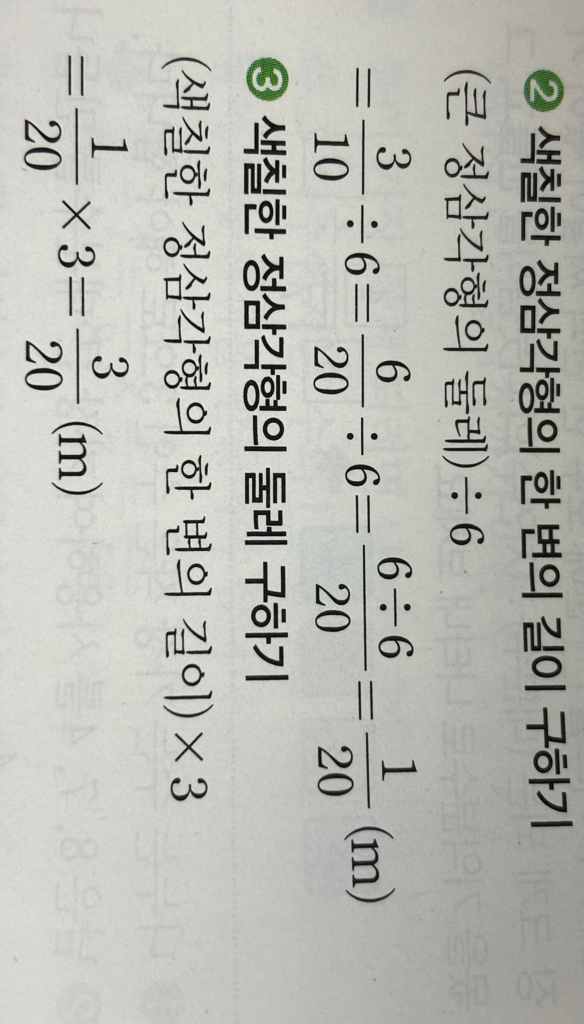 해설 보면 ’ 2번째에 색칠한 정삼각형의 한 변의 길이 구하기 ’ 이 부분에서 풀이 보면 10분의 3 나누기 6 = 20분의 6이라고 나와있는데 답이 왜 20분의 6인지 몰르겠어요. 제 풀이에 따르면 20분의 1이거든요.