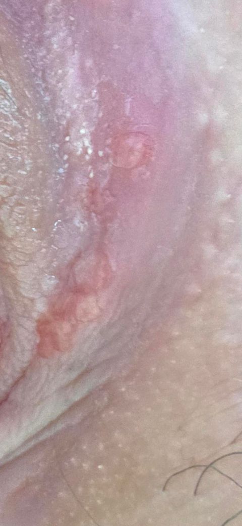 사진상으로는 대음순 피부에 국소적인 붉은 병변과 미란(살짝 벗겨진 상처처럼 보이는 부분)이 보입니다. 말씀하신 “관계 후 2일 뒤 발생, 닿으면 따가움”이라는 경과를 종합하면 가장 흔한 것은 마찰이나 미세 손상에 의한 외상성 피부염 또는 접촉성 자극입니다. 관계 시 마찰, 건조, 혹은 콘돔·윤활제 성분에 대한 자극으로 이런 형태가 생길 수 있습니다.