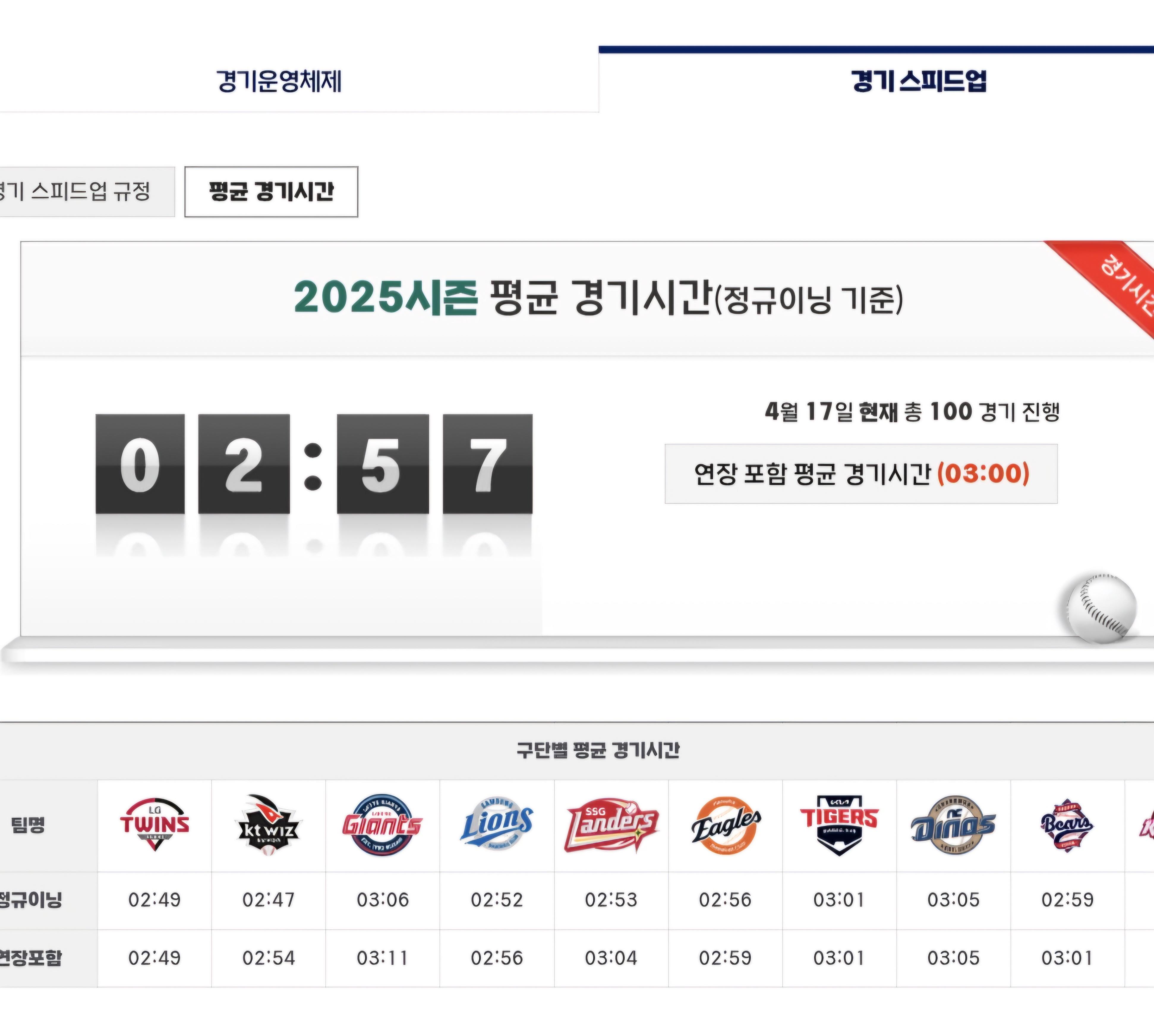 현재 4월 17일까지 100경기가 치러진 시점에서 정규이닝 9이닝을 기준으로 2시간 27분, 연장을 포함한 전체 경기시간은 3시간 00분으로 지난 시즌보다 훨씬 경기시간이 줄었습니다.