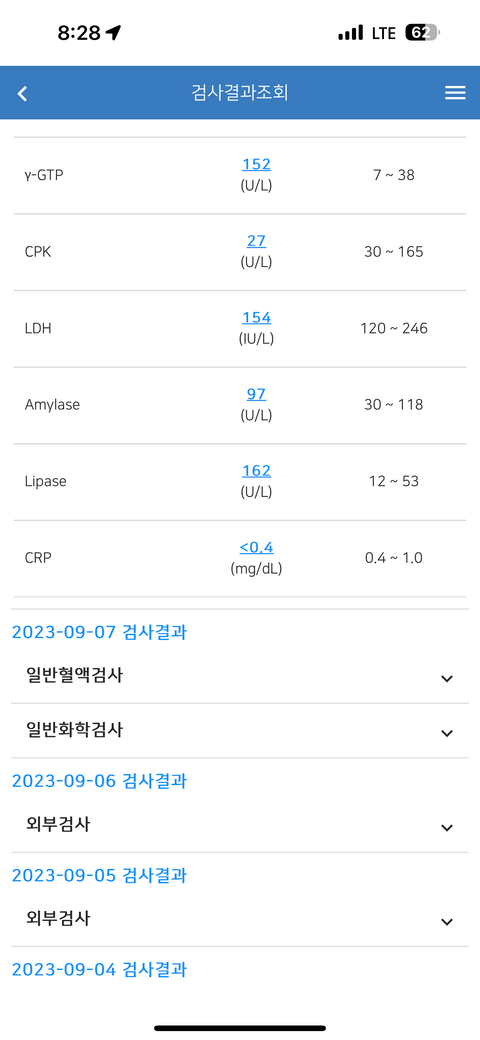 오늘 9/8일에 아밀라아제는 정상 라파아제가 47에서 162로 수치가