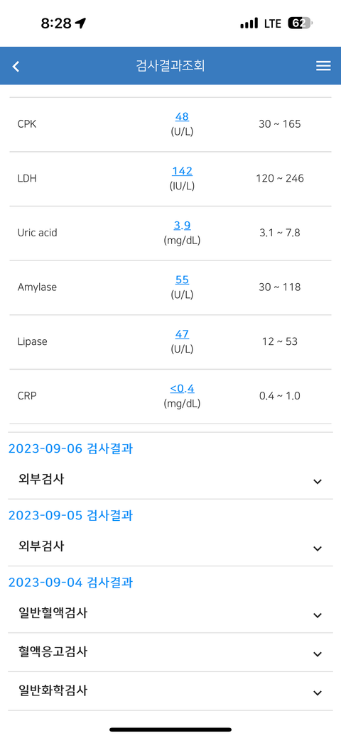 피검사결과에 9/7에는 아밀라아제/라파아제가 정상인데