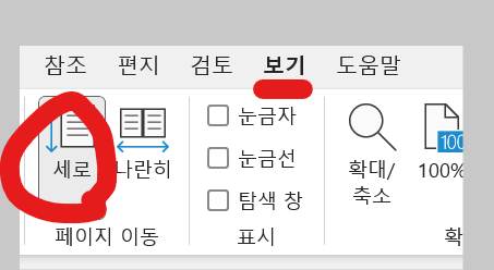 위에 메뉴 중에서 "보기"를 누르신 후 "세로 보기"를 선택하시면됩니다.
