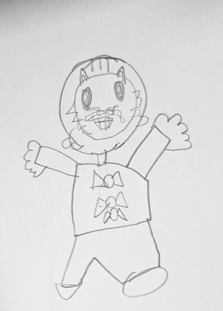 웃는 얼굴과 치아 표현은 긍정적인 자아상과 밝은 정서 상태를 의미합니다. 자신을 긍정적으로 인식하고 있다는 증거입니다. 가슴팍의 리본은 주목받고 싶은 욕구, 자신을 특별하게 여기고 싶다는 감정을 나타낼수 있습니다. 최근 동생이 생기면서 주목도가 줄었드렀다고 느끼는 심리일수 있습니다. 고양이탈은 고양이처럼 되고 싶다거나 고양이로 변장해 감정을 숨기고 싶은 무의식적 표현일수 있습니다. 최근 막내 동생 출생으로 인해 무의식적으로 주목받고 싶은 마음이 커졌을 가능성이 있으니 아이만의 시간을 갖고 애정표현을 충분히 해주세요
