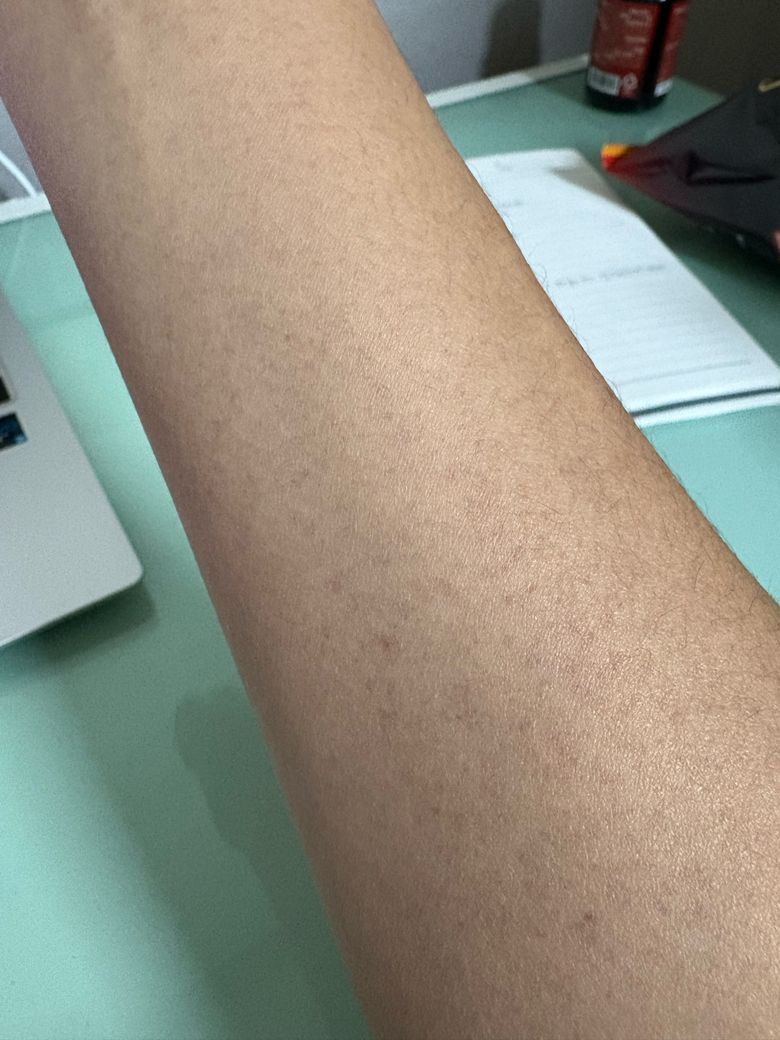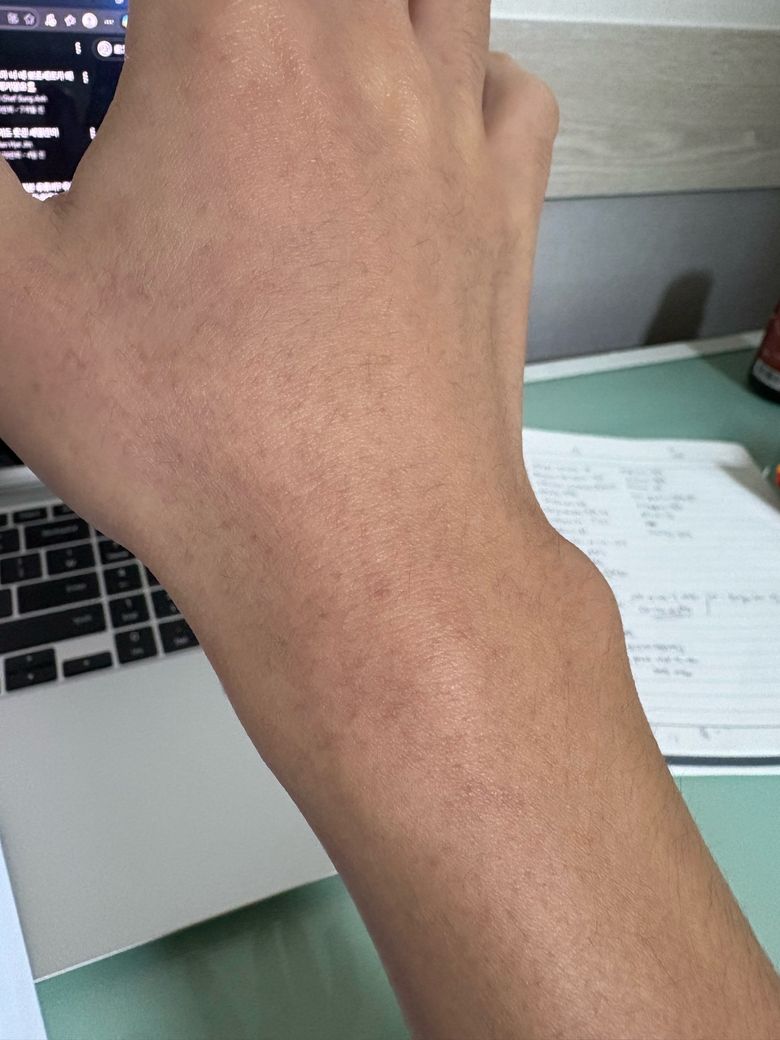 말 그대로 입니다 양쪽도 아니고 오른쪽 전완근부터 손등까지 작은 붉은 반점이 생겼어요 이게 뭔가요..?