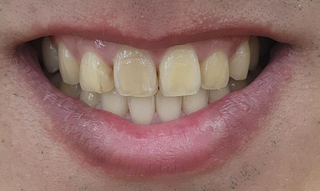 치아색이 착색이 된 부분이 보입니다. 착색이 된 부분은 간단하게 치코에서 제거할 수 있습니다. 치아색이 노랗게 어두워진 부분은 치과에서 미백으로 치아색을 밝게 만들 수 있습니다.