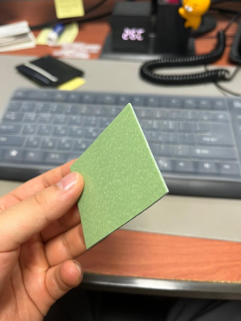 사진 속 재질은 일반 종이보다는 PVC보드 또는 포맥스 보드 계열로 보입니다 한쪽은 매끈하고 한쪽은 우둘투툴 하며 단단해 건축 자재 샘플이나 간판 모형 제작 인테리어 자재로 많이 쓰이고있습니다