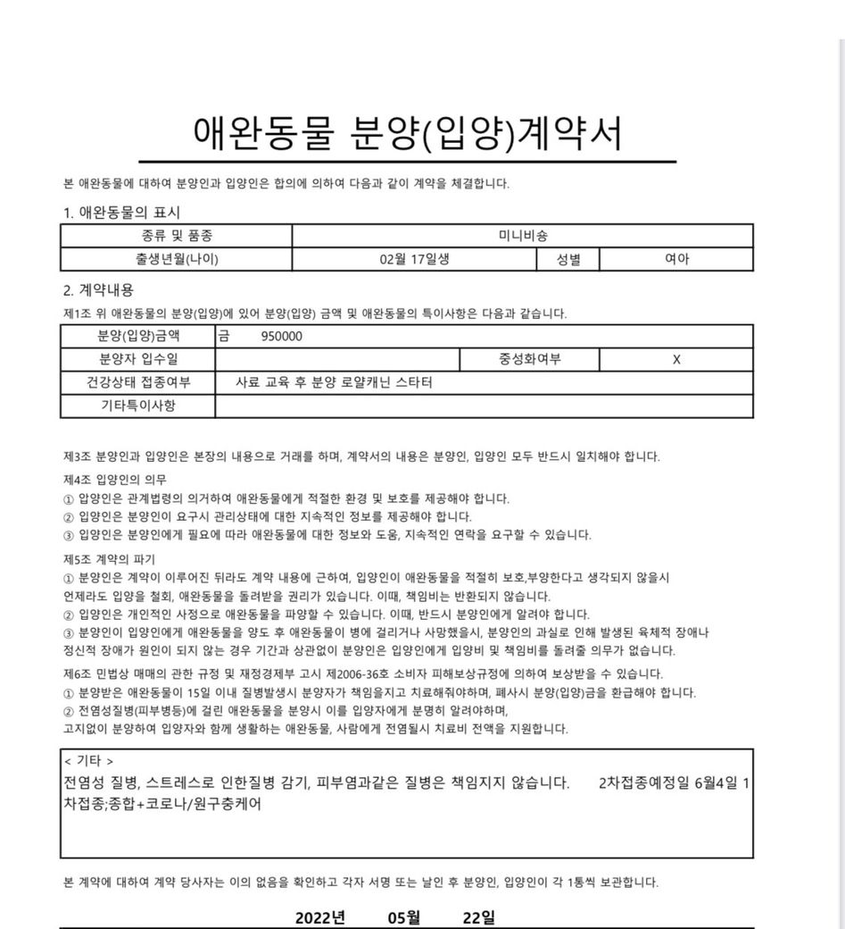 가정분양으로 진행되었고 입양계약서는 강아지 데리고 나온 뒤 전 견주분께서 PDF 파일로 보내주셨구요