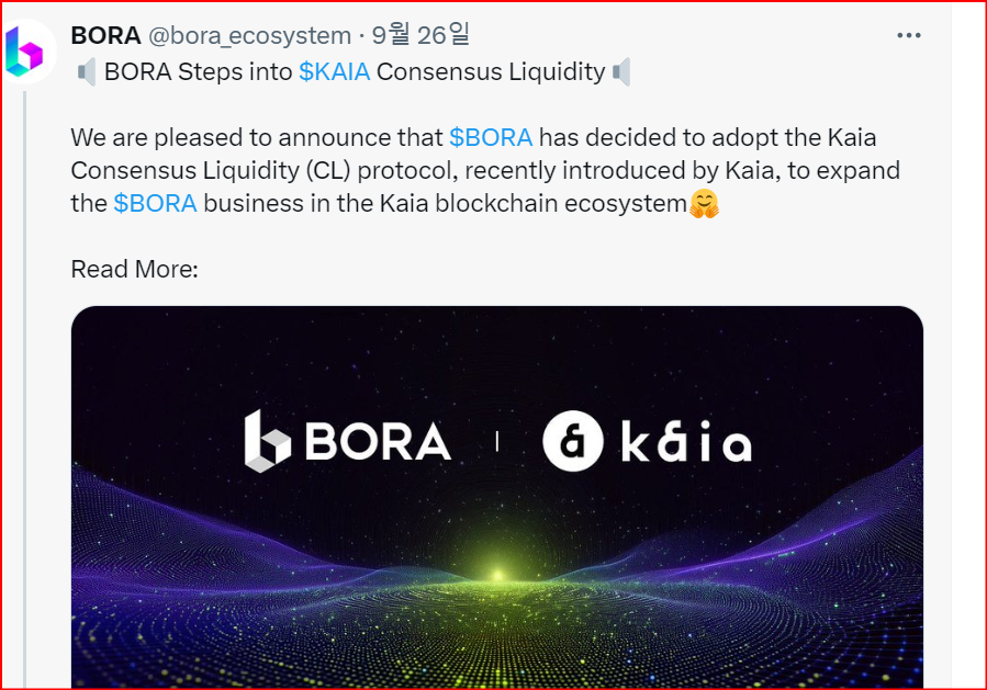 현재 보라코인의 공식 X에서 가장 최근에 올라온 업데이트는 카이아의 CL을 도입하는 것이 마지막 입니다.